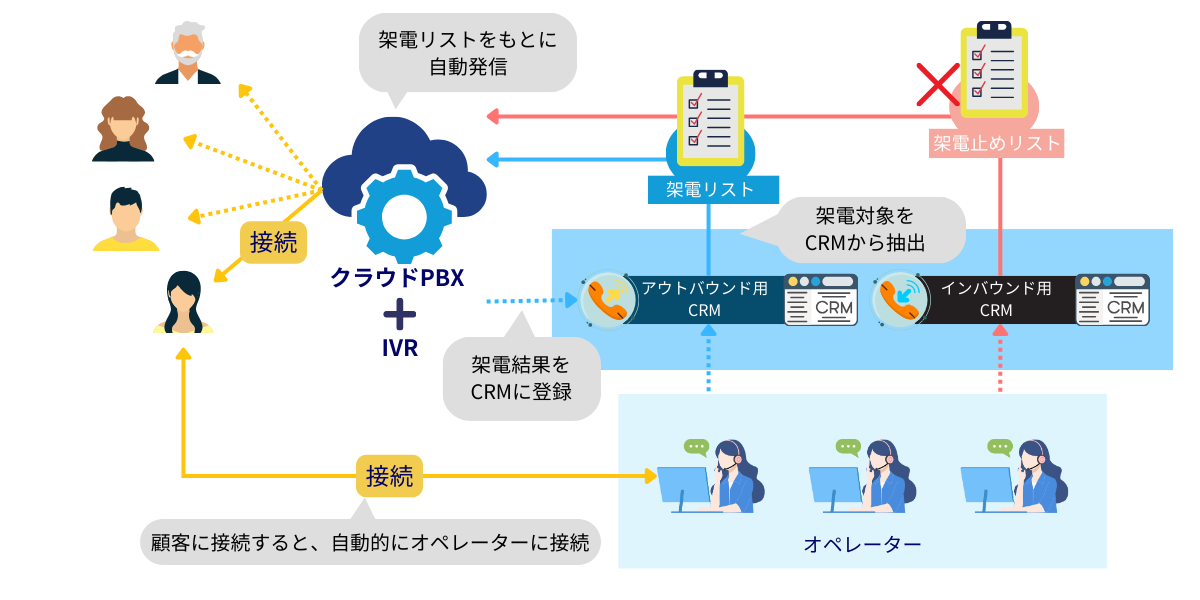 オートコールが発信自動化を担い、クラウドPBXが受電〜管理までを担うことで、